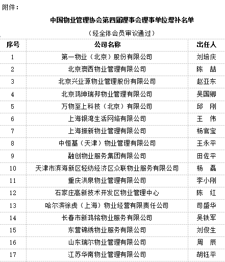 为适应行业发展和协会建设需要,根据会员单位申请,经网上公示并全体会员审议通过,决定增补第一物业(北京)股份有限公司等35家单位为本会第四届理事会理事单位。