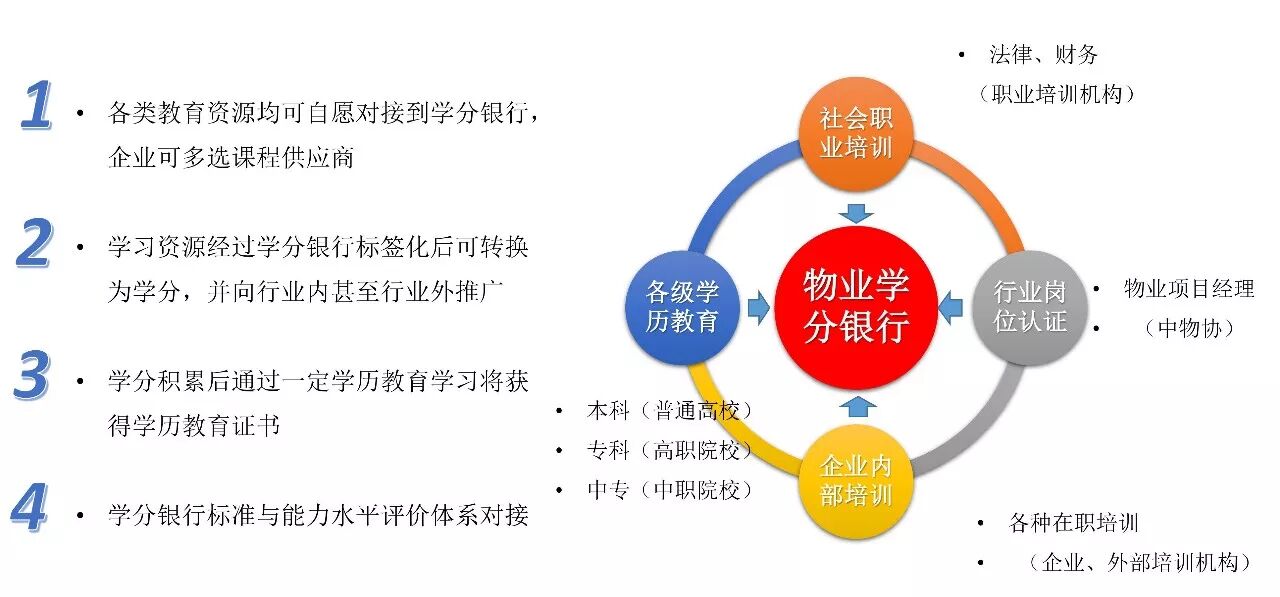 前段时间,我写了一篇文章——《以学分银行建设为引领 努力构建我国物业管理行业终身学习立交桥》,主要探讨如何通过完善制度设计把职业培训和继续教育衔接起来,调动大家积极性,形成导向,让学习成果得到更多、更有价值的认可,包括学历方面和岗位证书方面的认可。国家开放大学是教育改革工作重点推动单位。国家开放大学学分银行已与多个行业和机构开展合作,并发布学分银行认证单元,加快推动行业特色专业建设和双证融通工作,创新人力资源发展模式。对于这套模式和较为成熟的质量控制体系,物业管理行业完全可以采用“拿来主义”,进行符合行业特点的“本土化”改造并推广使用。